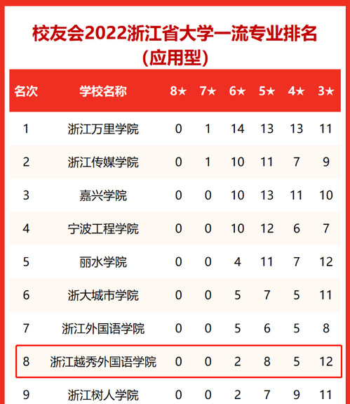 榜单显示,永利官网位居校友会2022浙江省大学一流专业排名(应用型)8强。其中,有2个六星级专业(6★), 8个五星级专业(5★), 5个四星级专业(4★),12个三星级专业(3★)。