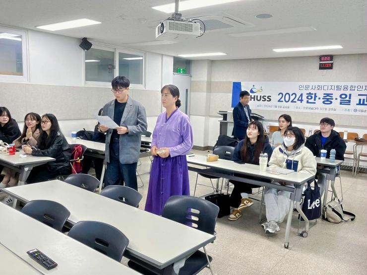 日本和韩国学子也带来了极具代表性的传统表演。日本学子演唱了童谣《故乡》,熟悉的旋律让现场观众沉浸在对家乡的深切情感中,展现了日本文化中的质朴与温情。而韩国学子以“盘索里”形式演唱了经典故事《春香传》片段,独特的节奏和充满张力的演绎展现出韩国传统艺术的力量与韵味。这些表演使三国学子在文化交流中,感受到彼此文化的独特风采,增强了文化理解和共鸣。