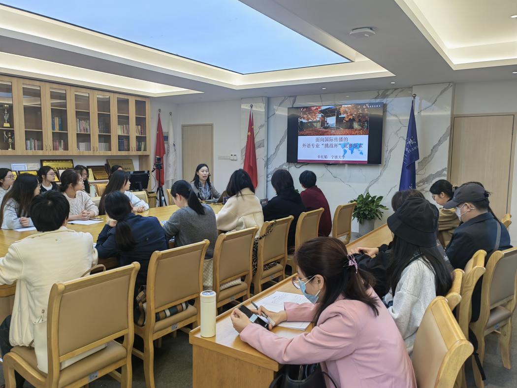 2024年11月12日,英语学院迎来了一场别开生面的学术活动,邀请宁波大学外国语学院辛红娟教授开展专题讲座——面向国际传播的外语专业“挑战杯”竞赛探索。讲座由英语学院商务英语系主任陈琨琨主持,吸引了校内30余名师生热情参与。英语学院院长陈科芳教授出席讲座。