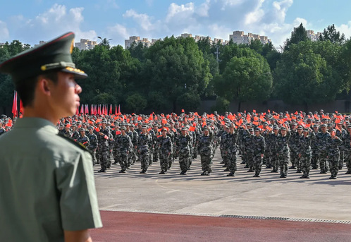 全体起立、奏唱国歌,国旗伴着国歌冉冉升起,2021级新生开学典礼拉开帷幕。标兵方队手举军训团团旗,踏着铿锵的步伐入场,吹响了新生军训汇报表演开始的号角。2021级新生矫健的步伐、洪亮的口号,充分展现了入学以来的训练成果,也彰显了他们艰苦训练的意志和青春蓬勃的朝气。